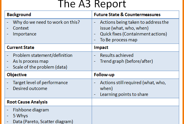 Lean CIWhy use the A3 Report? Here are 4 Reasons: 1) Document and solidify your Continuous Improvement efforts. 2) Provide a ‘Template’ to train associates on a ‘Natural’ solution discovery process. 3) Provide a ‘Reference History’ to solve recurring issues. And 4) Allow a constructive path for associates to participate in CI efforts.